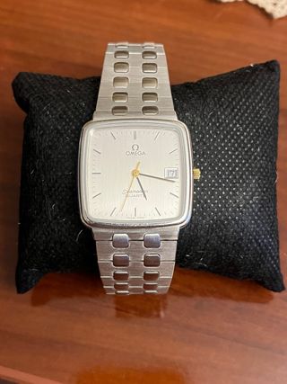 Elegante reloj Omega Seamaster de cuarzo con una esfera plateada y detalles dorados. - Caja y brazalete de acero inoxidable. - Indicador de fecha. - Movimiento de cuarzo suizo.