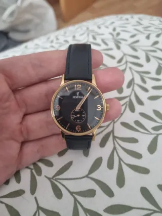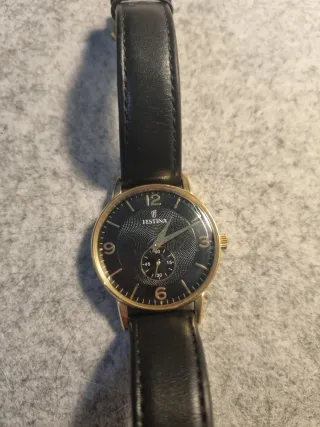 Elegante reloj Festina con correa de cuero negra y detalles dorados en la esfera. - Movimiento de cuarzo. - Acero inoxidable dorado. - Resistencia al agua 3 ATM - Anchura 36mm. - Diseño formal y sofisticado. - Esfera negra con números arábigos dorados.