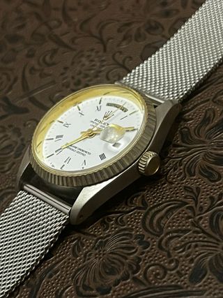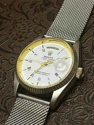 Elegante reloj copi Rolex Oyster Quartz Day-Date con una combinación de colores dorado y plateado. - Esfera blanca con números romanos. - Indicador de día y fecha. - Correa de malla metálica.
