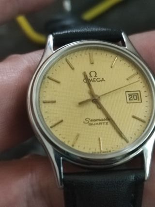 Elegante reloj Omega Seamaster Quartz con esfera dorada. - Caja y detalles en tono plateado. - Correa de cuero negra. Funciona perfectamente Muy bien estado, tengo un certidicado de autenticidad
