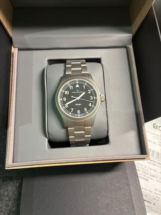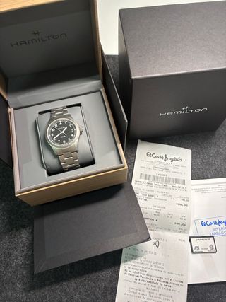 Reloj Hamilton Khaki Field Quartz con caja y brazalete de acero inoxidable. La esfera es de color negro. - Caja de acero inoxidable. - Brazalete de acero inoxidable. - Esfera negra. - 38 mm - Movimiento de cuarzo. - Como nuevo. - Dotación completa PVP: 495€