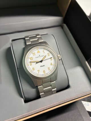 Reloj Hamilton Khaki con movimiento de cuarzo. La esfera es de color blanco y la caja y correa son de color plateado. - 38 mm. - Correa de acero inoxidable. - Cierre desplegable. - Movimiento de cuarzo. - Como nuevo.