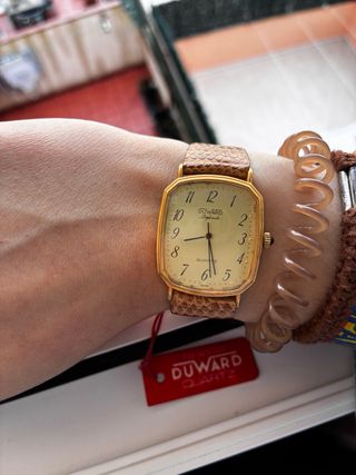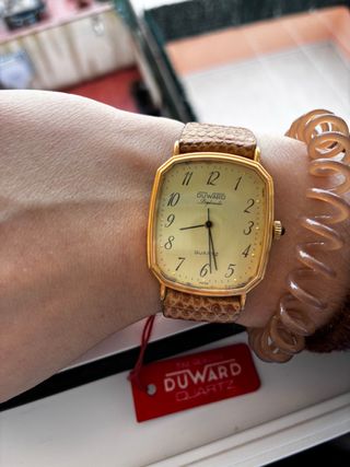 The watch in the image is a Duward Diplomatic Quartz watch. Duward is a Spanish watch brand with Swiss origins that has been around since 1930. The watch features a gold-plated case, a light-colored dial with black Arabic numerals, and a brown, textured leather strap.