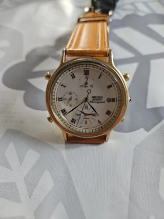 Reloj Seiko Quartz Chronograph con función de alarma. La esfera es blanca con números romanos y detalles dorados. Año 1990 - Correa de cuero marrón. - Caja dorada. - Esfera con subesferas para cronógrafo y alarma.