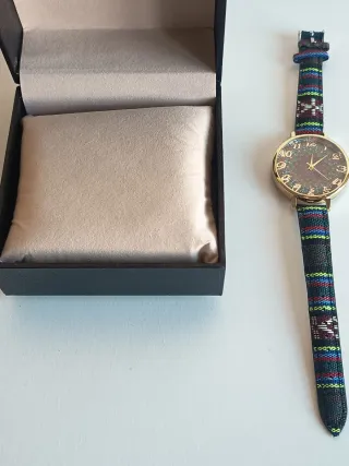Reloj de pulsera con un diseño vibrante y llamativo en la esfera. - Esfera con estampado de mandala. - Correa de tela con diseño étnico. - Caja dorada. - Envíos en 24H, se envía con caja. - Nuestras valoraciones nos avalan. - Regalo para todos nuestros clientes.