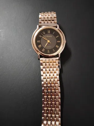 Elegante reloj VERNI con un diseño clásico vintage. - De pila, conocido por su precisión. - Mide 6 cm correa cerrada. - Esfera negra y redonda con números romanos en dorado. - Correa alemana metálica de eslabones Rowa, años 50/70. - Movimiento de cuarzo. - Correa y black: stainless steel. - FUNCIONA PERFECTAMENTE.