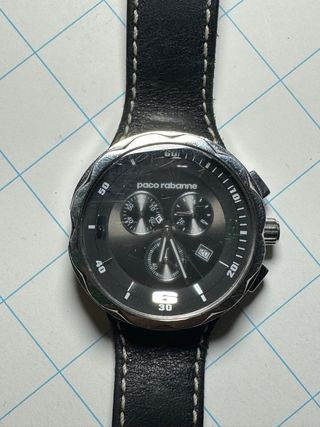 Brand: Paco Rabanne Model / Reference: PRH925 Movement: Quartz chronograph Case: Stainless steel Water resistance: 100 meters (10 ATM) Crystal: Mineral Functions: • Chronograph (3 sub-dials) • Date window at 4 o’clock • Luminous hands • Screw-down style caseback • Leather strap (original) ➡️ The reference PRH925 is clearly engraved on the caseback ➡️ Marked “ALL STAINLESS STEEL – WATER RESISTANT 100 METERS” ➡️ Original Paco Rabanne buckle This confirms 100% authenticity.
