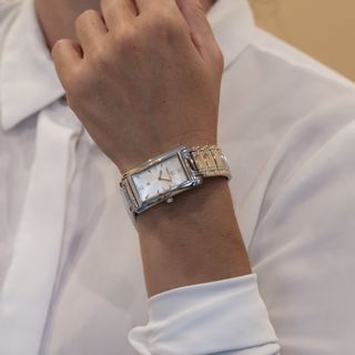 Elegante reloj de pulsera con un diseño clásico y sofisticado. - Esfera rectangular. - Correa de eslabones combinada en dorado y plateado. - Indicadores de hora en tono dorado. No sé si funciona .