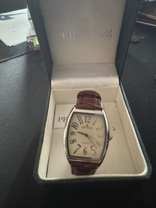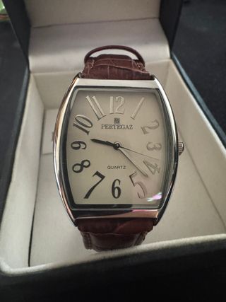 Vendo reloj PERTEGAZ original, elegante y atemporal, ideal tanto para uso diario como para vestir. Características: Marca: Pertegaz Movimiento: Quartz Caja metálica con forma rectangular Esfera clara con números grandes y diseño clásico Correa de piel marrón (en buen estado) Cristal en buen estado Incluye caja original Pertegaz (ver fotos) Funcionando correctamente Ideal para: Regalo, colección o para quien busque un reloj elegante y discreto de una marca reconocida.