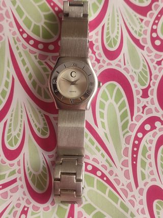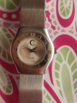 Reloj Quartz. Funciona a pilas. Funciona correctamente. La esfera mide 2'5 cm y cerrado la correa mide 6 cm aproximadamente. El cierre funciona con un pequeño botón lateral.