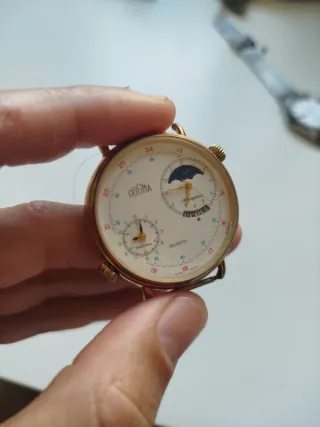 Elegante reloj Dogma con esfera blanca y detalles dorados. Un accesorio clásico y funcional - funciona correctamente - la caja tiene desperfectos como se aparte en las imágenes - Diseño con subesferas. - Indicador de fase lunar. - no trae correa