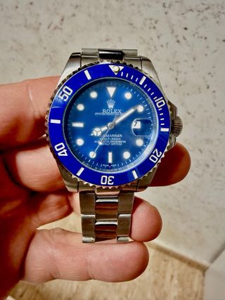 Reloj de pulsera Rolex Submariner con esfera azul y detalles plateados. Cuando se pone en hora se retrasa 5 min, es el único defecto que tiene, de ahi el precio. - Bisel giratorio azul. - Correa de eslabones plateada. - Ventana de fecha.