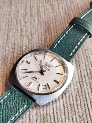 Reloj Longines Ultra Chron automático con certificación de cronómetro, ref 8355 en estado de coleccionista, rotor con oro de 18klts, el más barato y en mejor estado de europa, hay muy pocos ultra chron chronometer. Oportunidad - Esfera plateada con acabado cepillado. - Indicadores de hora lineales aplicados - Ventana de fecha a las 4 en punto. - Correa de tela con diseño militar. #oris#hamilton#seiko#breitling#iwc#universalgeneve#certina#tissot