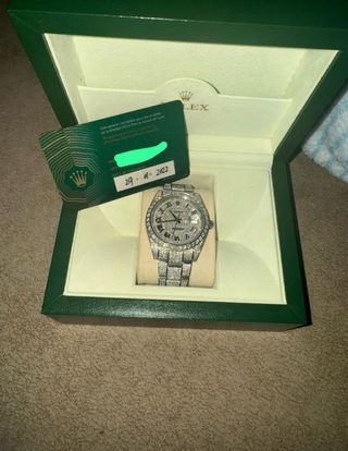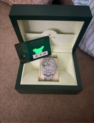 Reloj Rolex con incrustaciones de diamantes y caja original. - Bisel con diamantes. - Pulsera de eslabones con diamantes. - Esfera con números romanos. - Incluye tarjeta de garantía y caja.