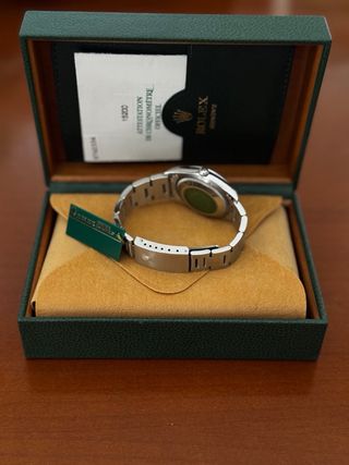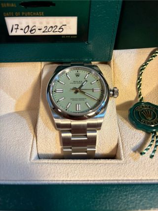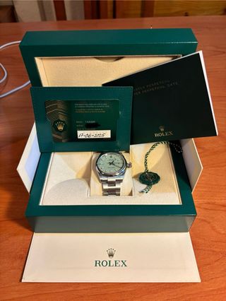 Reloj Rolex Oyster Perpetual con esfera verde y detalles plateados. Incluye su caja original y documentación garantia hasta el 2030. - Modelo: 134300 - Fecha de compra: 17-06-2025