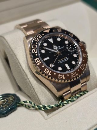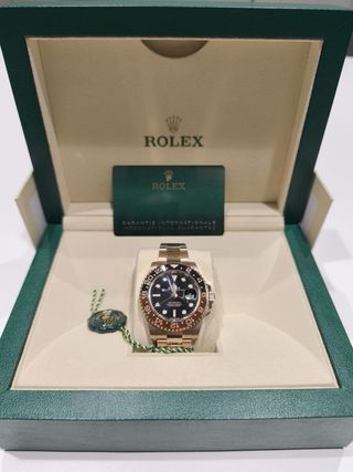 Reloj Rolex GMT-Master II Root Beer en oro rosa ROOTBEER REF: 126715CHNR AÑO: 2023 NUEVO CON STICKERS FULL-SET NO HAGO ENVÍOS. Todos los relojes se pueden revisar en la casa o en joyería de confianza para la tranquilidad del cliente. 100% originales con su documentación.