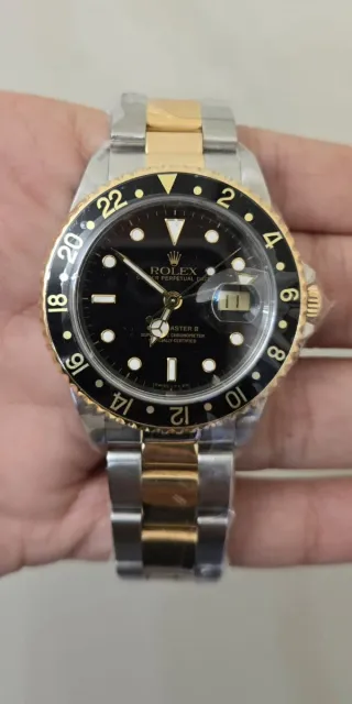 Reloj Rolex GMT Master II con caja y brazalete de acero inoxidable y oro. - Bisel giratorio con escala GMT de 24 horas. - Esfera negra con marcadores de hora luminosos. - Ventana de fecha a las 3 en punto. -ref:16713. -año:90/91. Se escuchan ofertas y cambios