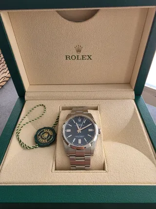 Rolex Oyster Perpetual 41mm con esfera azul. FULL SET , Caja y Papeles. Entrego en persona en Zona Nuevos Ministerios. Acepto prueba de autenticidad en la Rolex del Corte Inglés. También hago envíos. No mareeis porfa, sabéis lo que cuesta y sabéis que está en precio. Muy levemente negociable. - Modelo: 124300 - Esfera: Azul - Año 2023 - Garantía 4 años aún