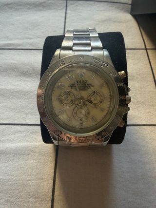 Reloj estilo Seiko MOD inspirado en el Rolex Daytona. -Movimiento cuarzo de Seiko Vk63. -Brazalete de goma. -Montado y ajustado con cuidado. -Funcionamiento correcto probado. 🔹¿Qué es un Seiko MOD? Es un reloj personalizado que utiliza un movimiento de cuarzo de Seiko, en este caso Vk63, conocido por su fiabilidad. Combinado con caja, correa y agujas aftermarket de calidad. No es una réplica ni un reloj falso. ‼️Prefiero responder las dudas ANTES de la compra, no después.