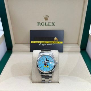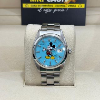 Modelo: OysterDate Referencia: 6694 Año: 1969-1970 Dial: Tiffany Material: Acero Movimiento: Automatico Diametro: 34MM Documentacion: NO Caja: SI Estado: Buen estado Reloj Rolex OysterDate con esfera diseño de Mickey Mouse color Tiffany. - Esfera turquesa con personaje de Mickey Mouse. - Indicador de fecha. - Brazalete de acero inoxidable.