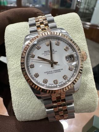 Elegante reloj Rolex Datejust de 32 mm con detalles en oro rosa. - Bisel estriado. - Esfera blanca con diamantes - caja y documentación - Brazalete Jubilee bicolor (acero y oro rosa). - Año 2008