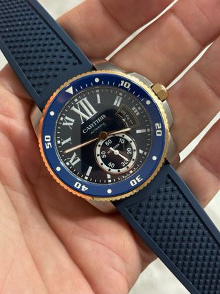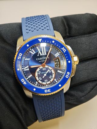Elegante reloj Cartier Calibre - Bisel giratorio azul. -42mm Acero y oro Rosa. - Correa de caucho azul. - Ventana de fecha. -300 metros como nuevo ! solo reloj. se escuchan cambios por otros relojes Cartier Omega Rolex Patek etc