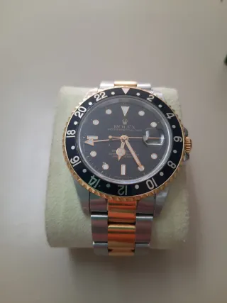 Reloj Rolex GMT Master 2, modelo 16713. Una pieza icónica que combina acero y oro. - Bisel giratorio con marcadores de 24 horas. - Esfera oscura. - Brazalete de acero y oro. - Cal 3185 de rolex - Del 1995 - Tiene caja original y factura banco transferencia. - Ofertas absurdas no contestó. - Damos un año de garantía en todos nuestros relojes. - No envíos. - PRECIO CERRADO !! NO HAY REBAJAS. me pregunte un descuento no contestó. - Se pasa video del reloj.