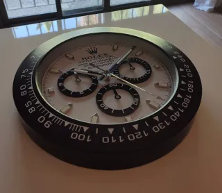 Reloj de pared con diseño inspirado en Rolex Daytona "Panda".⬛⬜ CARACTERÍSTICAS: -Diseño elegante y detallado. -Bisel negro con marcadores. -Esfera blanca con detalles luminiscentes. -Indicadores de hora y manecillas con acabado plateado. -Carcasa metálica. -Díametro de 35 centímetros. No dudes en preguntarme cualquier duda, estoy abierto a negociaciones.📥 Si te interesa otro modelo, puedes escribirme y ver todos los que tenemos.😄