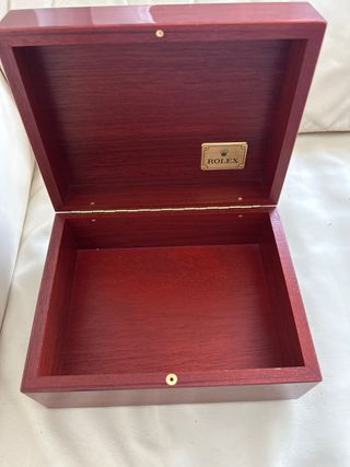 Preciosa caja de madera esmaltada. Es la que traían los Rolex Daytona de oro de finales de los 80 hasta el año 2000 aprox. Está en muy buen estado, lo más que tiene es un toque en una esquina trasera, muy poca cosa. Rolex. Patek Philippe. Audemars Piguet. Vacheron Constantin. Lange & Söhne. Jaeger Le Coultre. Breguet. Cartier. Blancpain. Omega. IWC. Zenith. Breitling. Tudor. Hublot.