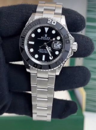 Reloj Rolex Yacht-Master con esfera negra y detalles plateados. - Bisel giratorio bidireccional. - Ventana de fecha. - Brazalete de acero inoxidable.