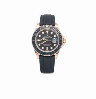 Reloj de pulsera Rolex Yacht-Master con detalles en negro y plateado. - Bisel giratorio unidireccional. - Ventana de fecha. - Correa de caucho. - Esfera negra.