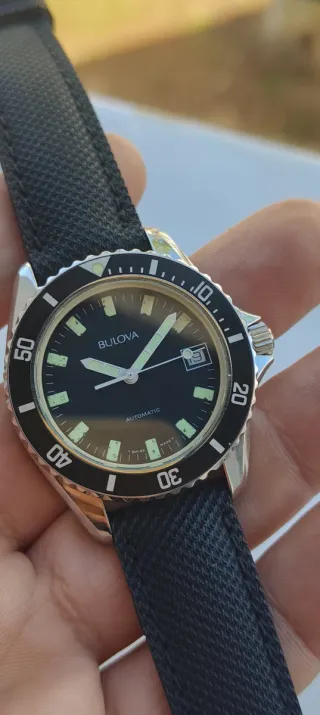 Reloj de pulsera Bulova estilo diver con correa negra. Funciona perfectamente, 37mm sin corona. No envío por la aplicación!!!! Envío previo pago por BIZUM o transferencia. omega.longines.certina.cyma.universalgeneve.rolex.tudor.breitling.heuer.tressa.angelus.citizen.bulova.hamilton.zodiac.cauny.dogma.tissot.cartier.hublot.seiko.casio.panerai.montblanc.duward.aquastar.eberhard.eterna.jaeger.vacheron.patek.diver.coleccinismo
