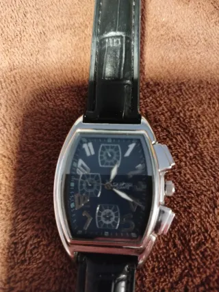 Elegante reloj de pulsera con caja plateada y correa de cuero negra. - Diseño rectangular. - Esfera azul con detalles plateados. - Correa de cuero con textura. No es un rolex, TAG Heuer Casio,Festina, breitling Tudor Rado