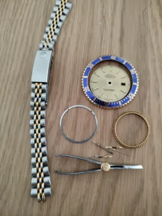 Conjunto de piezas para reloj Roler ESCUCHO OFERTAS. - Bisel con detalles en azul y dorado. - Esfera dorada con marcadores. - Aro interior metálico. - Agujas y otros componentes pequeños.