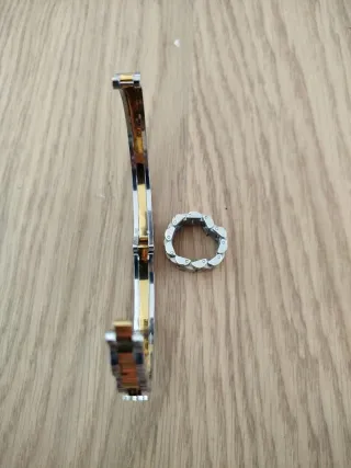 Conjunto de pulsera y anillo fabricados en acero inoxidable. - Diseño elegante y moderno. - Combinación de tonos dorados y plateados.combinacion con reloj rolex