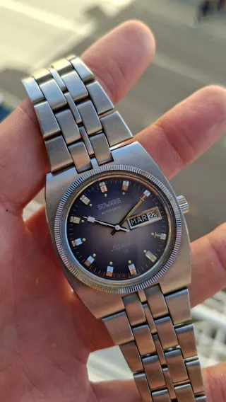 Reloj Duward Aquastar en estado NOS (New Old Stock). Un modelo automático con un diseño clásico. - Esfera azul con detalles luminiscentes. - Movimiento ETA - Únicamente desgaste de almacenamiento - Ventana de día y fecha. - Brazalete de acero inoxidable. omega.rolex.tag.heuer.breitling.tudor.tissot.longines.certina.hamilton.seiko.orient.citizen.oris.mido.junghans.fortis.sinn.bulova.panerai.cartier.bulgari.chanel.dior.gucci.armani.dolce.gabbana.michael.kors.hublot.patek.phil