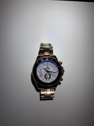 Reloj de pulsera Rolex Yacht-Master II en oro. Un accesorio de lujo con un diseño distintivo. - Bisel azul. - Esfera blanca con detalles en rojo. - Brazalete dorado