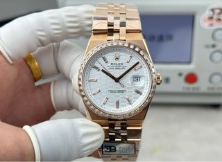 Reloj Rolex Oyster Perpetual con baño de oro rosa y detalles en blanco. - Bisel con incrustaciones. - Esfera con patrón de panal. - Indicadores de hora rectangulares.