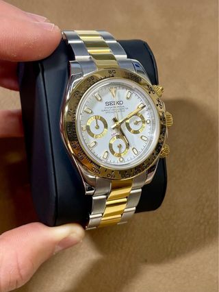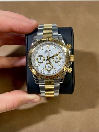 Reloj customizado con estética del Rolex Daytona dos tonos Oro y Acero con esfera blanca. Montado con mecanismo oficial de Seiko VK63: gran precisión del cuarzo y movimiento fiable. • Caja tipo Daytona de 40 mm, en acero inoxidable • Esfera blanca y dorada con subdiales funcionales • Cristal de zafiro • Movimiento OFICIAL Seiko VK63 • Correa estilo oyster • Cronógrafo funcional y taquímetro ✅ESTADO: Nuevo, sin uso. Para su funcionamiento, preguntar por mensajes. 📦Envío de 1-2 días laborables.