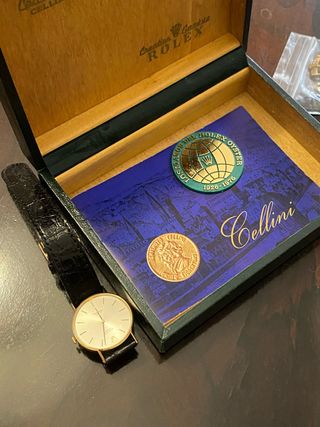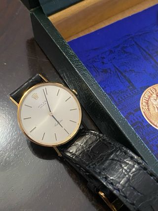 Reloj Rolex Cellini de oro con correa de piel. - Caja de de oro 32mm - Correa de piel negra de repuesto - Esfera clara - Caja y folleto original