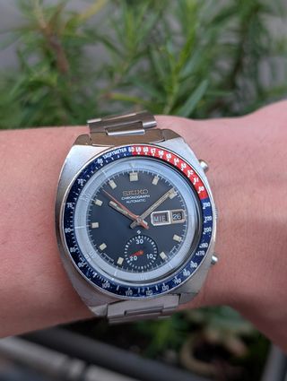 Seiko Pogue 6139-6002 Un solo dueño. Perteneció al padre de un amigo mío, quien lo compró a principios de los años 70. Calibre 6139B revisado; mantiene el tiempo con muy buenos parámetros (ver imagen 2). Todo original a excepción del cristal, que es aftermarket. El número 2N en la tapa trasera coincide con el del fondo de caja, lo que indica que son piezas correctas y originales. Funcionan correctamente el cronógrafo, el ajuste rápido de fecha y día, y el giro del bisel interior. Caja de 41 mm. Reloj en muy buenas condiciones generales, y difícil de encontrar todo original como este ejemplar. Abierto a ofertas razonables.