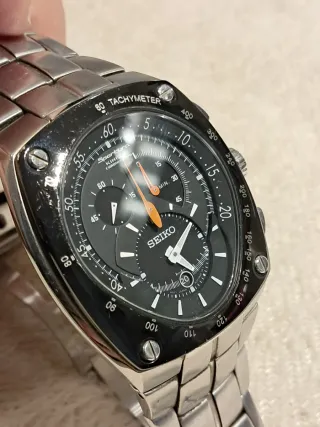Reloj Seiko Sportura con cronógrafo. Diseño deportivo y elegante. Reloj fonciona mantiene ahora perfecto recetia todo bien menos el segondiro recetia pero ala 1 - Bisel con taquímetro. - Esfera negra con detalles en blanxo - Correa de acero inoxidable.