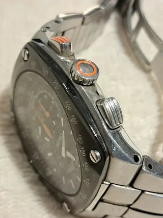Reloj Seiko Chronograph con caja y brazalete de titanio negro. Se entrega con su caja original y documentación. - Esfera negra con detalles naranjas. - Función cronógrafo. - Ventana de fecha. - Usado un par de veces