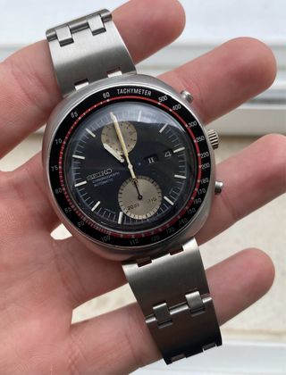 Seiko UFO Chronograph Automático Vintage – Ref. 6138 Se vende Seiko Chronograph Automático “UFO”, modelo mítico y muy cotizado entre coleccionistas. Una de las referencias más icónicas de Seiko de los años 70, cada vez más difícil de encontrar en buen estado y funcionando correctamente. ✔️ Funcionamiento perfecto • La hora funciona correctamente • Cronógrafo totalmente operativo • Reseteo exacto a las 12, como debe ser ✔️ Características • Movimiento Seiko automático 6138 • Caja tipo “UFO” original • Bisel taquímetro • Cronógrafo de época, robusto y fiable • Esfera original con pátina acorde a la edad Reloj auténtico
