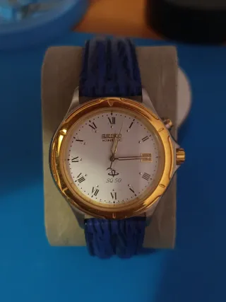 Reloj Seiko SQ 50 vintage, en condición de nuevo stock. Un accesorio clásico con un toque moderno. - Diseño con detalles dorados. - Correa de piel azul. - Esfera con números romanos.