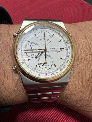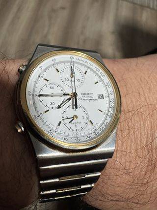 Reloj Seiko Quartz Chronograph con función de alarma. Un accesorio elegante y funcional. - Bisel con taquímetro. - Subesferas para cronómetro y alarma. - Recién cambiada la pila - Funciona correctamente - Vintage. Tiene 36 años - Pequeñas marcas de uso.