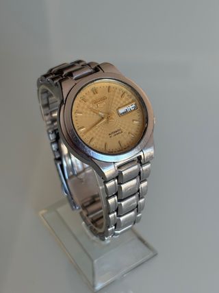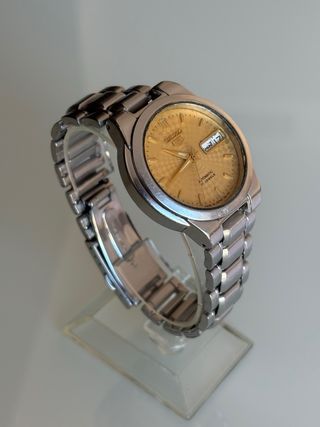 Reloj Seiko 5 automático con esfera dorada texturizada, un diseño muy atractivo y difícil de encontrar. Monta el fiable calibre 7S26, uno de los movimientos más reconocidos de Seiko por su durabilidad y sencillez de mantenimiento. Por antigüedad se recomienda una revisión general para dejarlo fino. Totalmente original en todas sus piezas, incluido el brazalete Seiko 5 con cierre firmado. Características • Marca: Seiko • Modelo: Seiko 5 • Calibre: 7S26 (automático, 21 rubíes) • Movimiento: Automático • Esfera: Dorada texturizada estilo “waffle” • Día/Fecha árabe/inglés • Brazalete Seiko 5 original • Diámetro aprox.: 36 mm