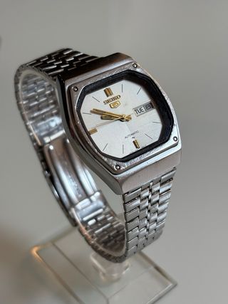 Seiko 5 automático vintage de los años 70, con su icónica caja cuadrada tipo “TV”, un diseño muy buscado por coleccionistas. Conserva brazalete original Seiko en acero y dial original suburst con índices aplicados en tono dorado. El reloj funciona al agitarlo, pero no se puede garantizar ni su precisión ni su reserva de marcha, ya que se desconoce su historial de revisiones. Por este motivo, se recomienda revisión para un uso diario. Ideal para coleccionistas, restauradores o amantes de los Seiko vintage con diseños diferentes a las cajas redondas clásicas.