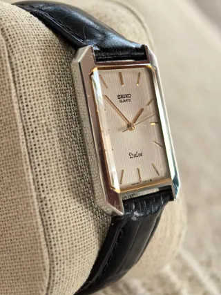 Reloj Seiko Dolce 9521 5060 JDM 1983. Tamaño: 25mm. Estado: Muy bueno. Pulsera de reemplazo. Estuche y manual. Durante las décadas de 1980 y 1990, la gama Dolce/Exceline, exclusiva del mercado japonés, se situó en la posición más elevada del catálogo de Seiko. Ésta se define por su diseño y su fabricación en materiales insólitos e innovadores. En concreto, este modelo fue realizado en la aleación SHA (plata, cobalto, cromo y nickel), que con una dureza de HV 700 destaca por su resistencia. Otros detalles que muestran su calidad son el cristal de zafiro biselado y la corona de ónix. # vintage, tank, tungsten, credor, grand, omega
