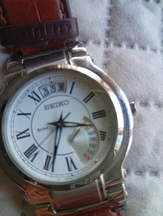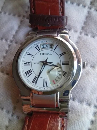 Elegante reloj Seiko vintage con correa de cuero marrón y detalles dorados. Un accesorio clásico que añade un toque de estilo. PRECIO NEGOCIABLE ✅ - Esfera blanca con números romanos. - Indicador de día y fecha. - Movimiento de cuarzo.